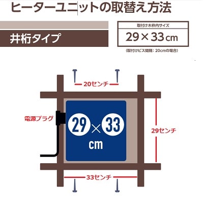 2、 既存のヒーターユニット本体を取り外し、新しいユニットの電源差し込み部を枠の切り欠き側へ合わせたのち4点のネジ穴が通るように位置を調整します。